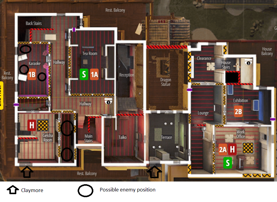 By planting claymores at Geisha window and terrace window, the only way defenders can jump out at you is through the Karoake window which should be covered by an attacker already. After securing each claymore, Thermite and Thatcher should focus on opening the Geisha wall. By throwing a Thatcher towards the outside balcony away from the nook, the EMP may destroy both the protection on the wall and the ADS protecting said defender in that position. If they are Bandit tricking, this will provide the perfect opportunity to use your frag grenades to eliminate the defender in the Geisha Room. Once this is done successfully, you will have free reign of an important part of the map. Remain weary of defenders using their Nitro Cell’s from below and defenders in both the hallway and in Karaoke. By this point and time the defender in Karaoke should be dead, but if not, you can easily assist your team by shooting through the wall at the defender in Karaoke.
